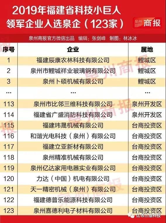 福建省公布了2019年503家企業入選“科技小巨人領軍企業培育發展庫”名單,其中就有123家泉企入選,占全省24.45%。
